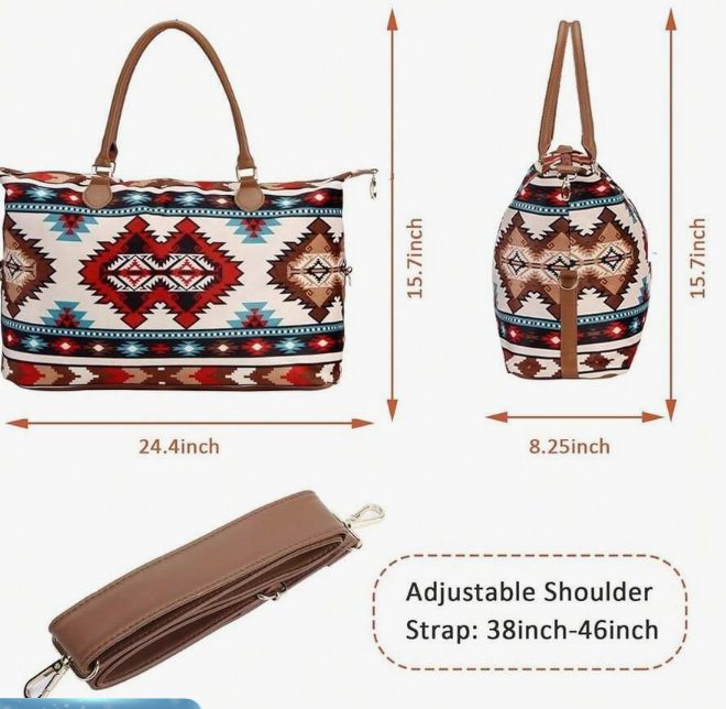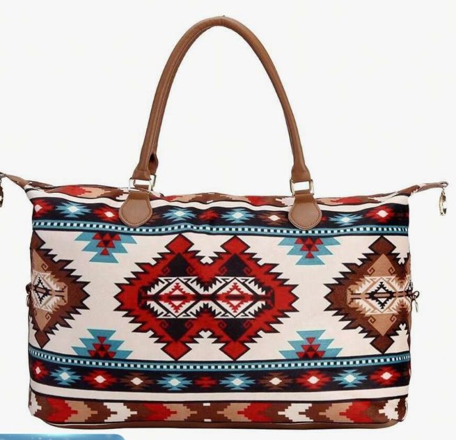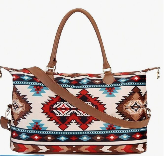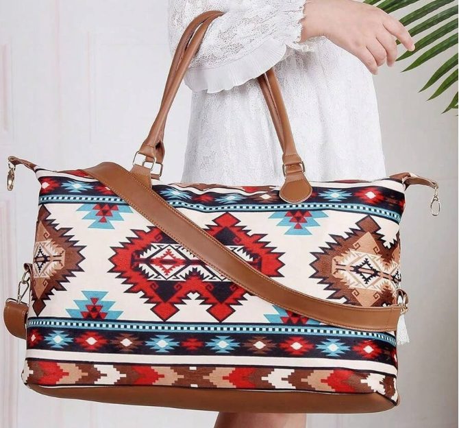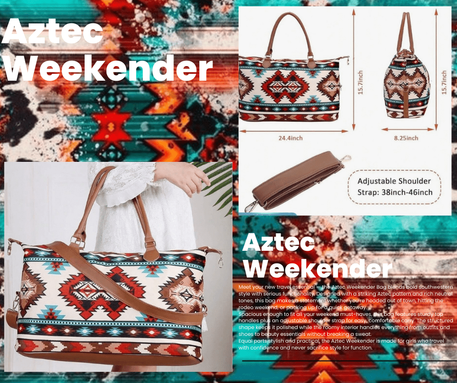 The Aztec Weekender Bag combines bold southwestern style with everyday travel functionality. Featuring a striking Aztec print, this spacious bag is perfect for weekend getaways, rodeo trips, or overnight travel.