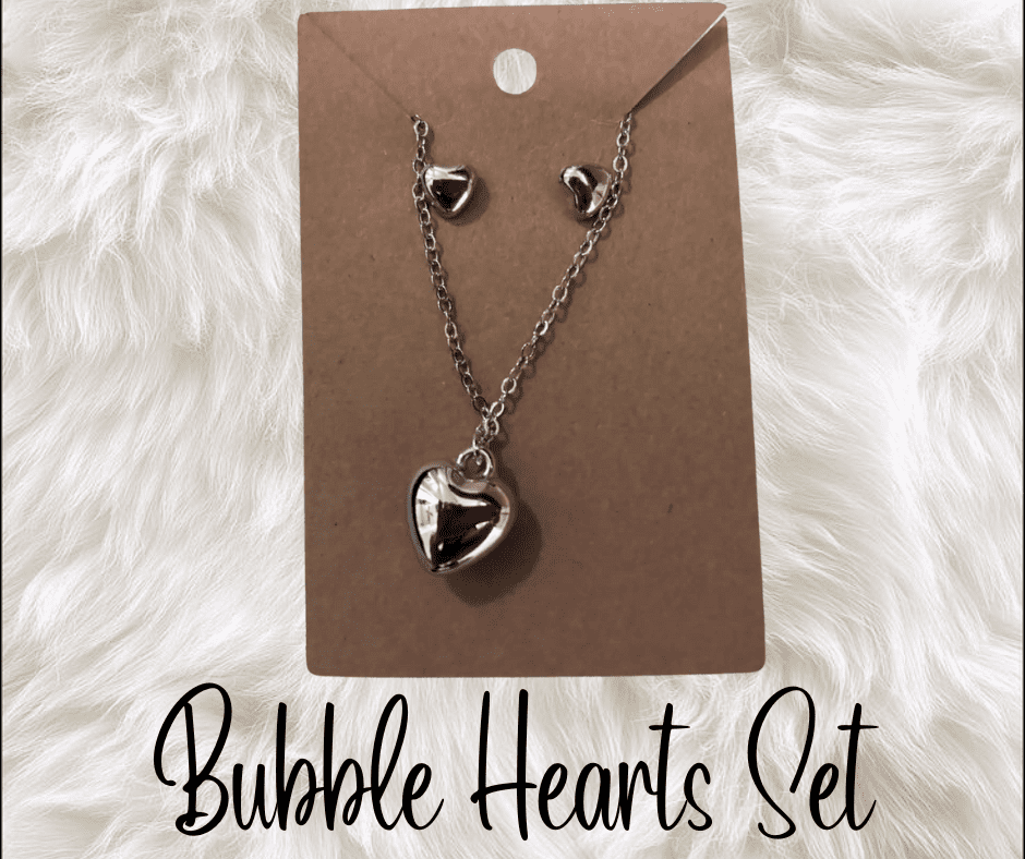 Sweet, shiny, and effortlessly chic. The Bubble Hearts Set features a polished heart pendant necklace paired with matching heart stud earrings for a timeless, feminine look. Lightweight and easy to wear, this set adds the perfect touch of shine—whether you’re dressing up or keeping it casual.