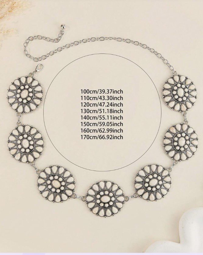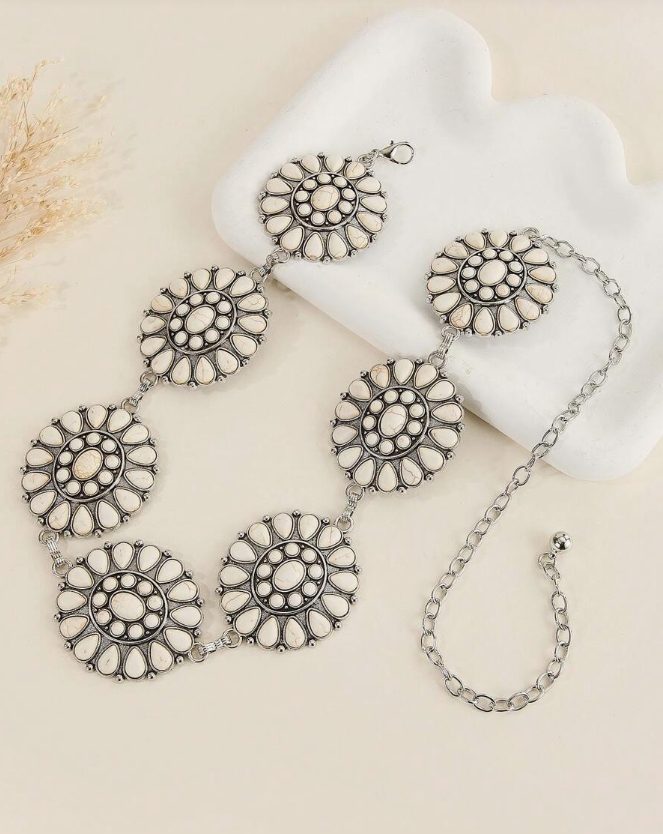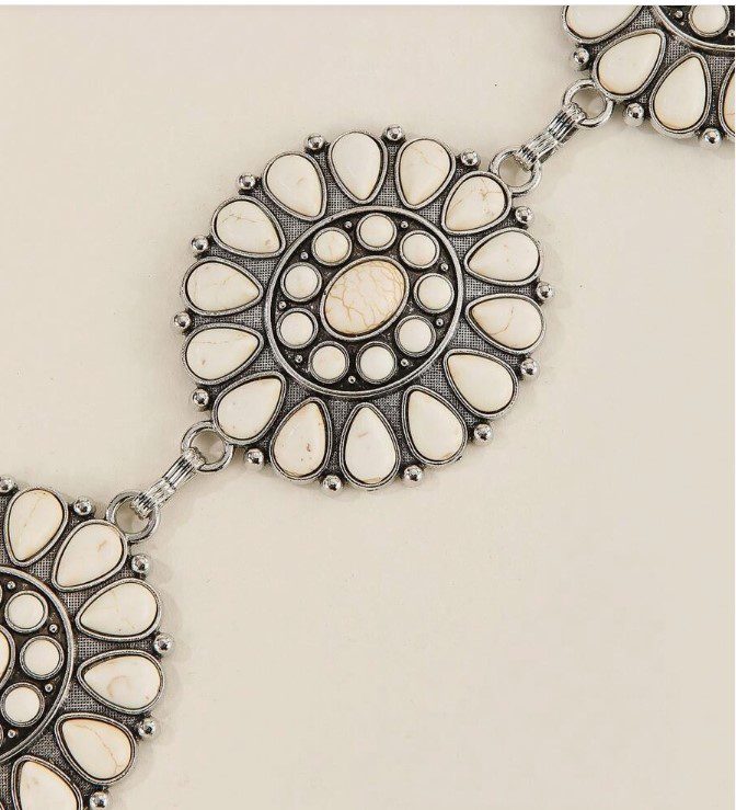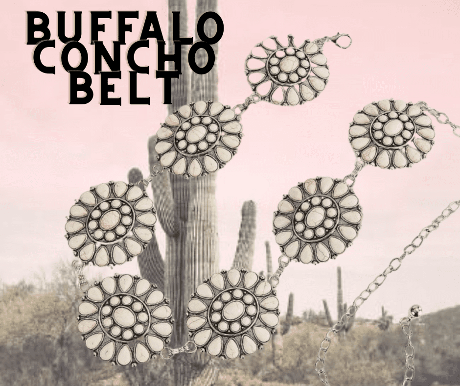 The Buffalo Concho Belt is a bold statement piece featuring oversized ivory-tone conchos with intricate detailing, linked together on a silver-tone chain for that classic western-meets-modern vibe.