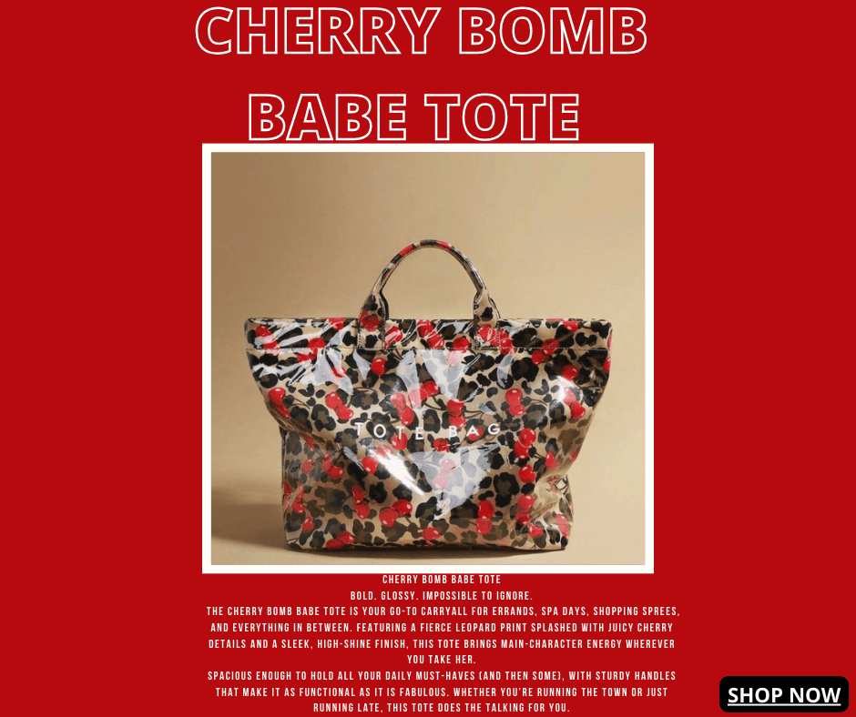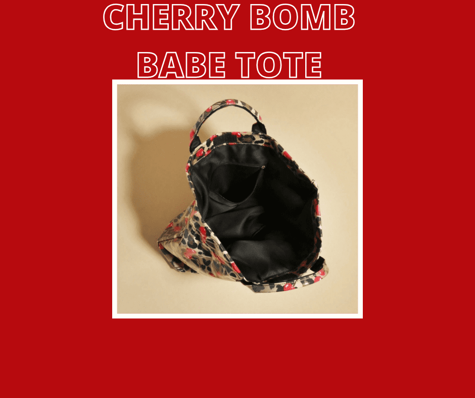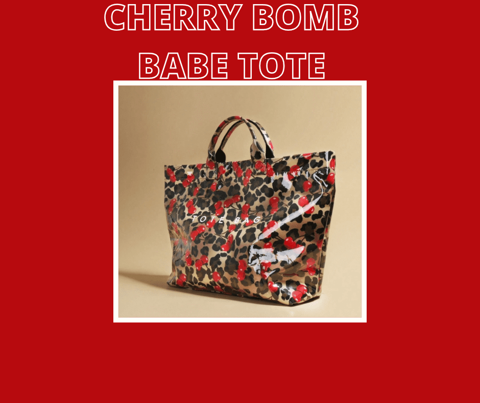 The Cherry Bomb Babe Tote is your go-to carryall for errands, spa days, shopping sprees, and everything in between. Featuring a fierce leopard print splashed with juicy cherry details and a sleek, high-shine finish, this tote brings main-character energy wherever you take her.