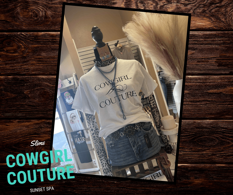 Where western charm meets elevated style. The Cowgirl Couture Tee is a must-have graphic tee for girls who love a little grit with their glam. Featuring a bold yet feminine “Cowgirl Couture” design on a classic white tee, this piece blends effortless comfort with boutique flair.