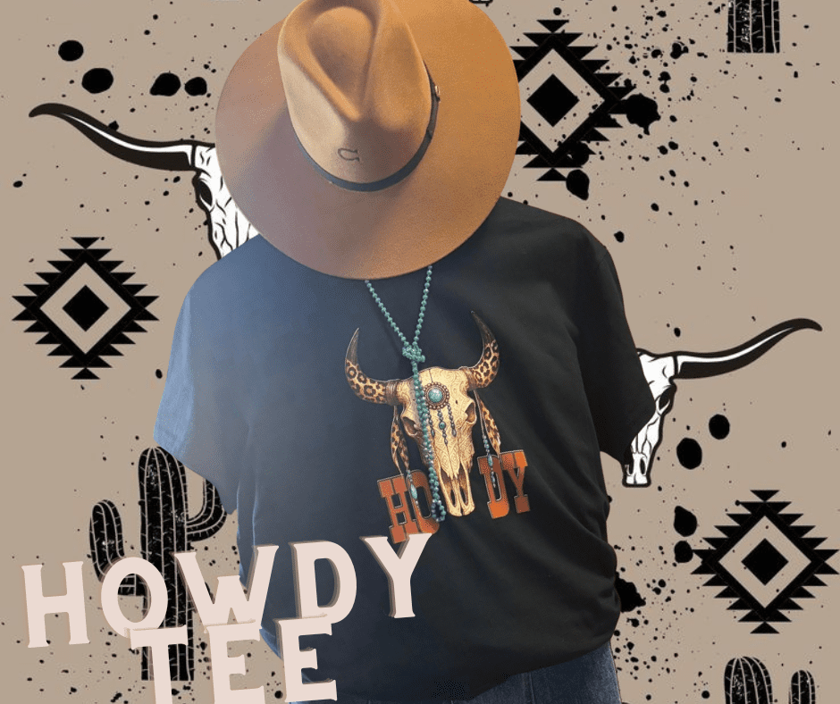 Serve western attitude with effortless style in the Howdy Tee. Featuring a bold longhorn skull graphic accented with turquoise details and a classic “Howdy” statement, this tee brings modern cowgirl energy with a touch of desert edge. Easy to style and endlessly wearable, it’s perfect for rodeo days, casual nights, or adding a little western flair to your everyday look.