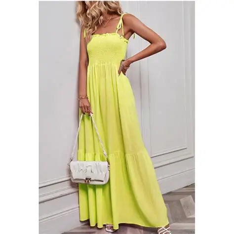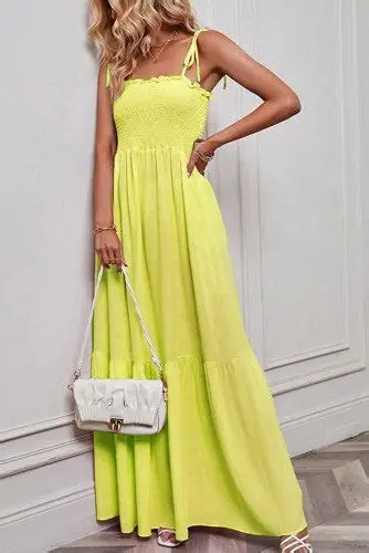 Turn up the glow in the Limelight Maxi. This stunning maxi dress features a flattering smocked bodice with adjustable tie straps and a flowy, lightweight skirt that moves beautifully with every step. The vibrant lime hue makes this dress an instant standout — perfect for summer events, vacations, beach dinners, or anytime you want all eyes on you.