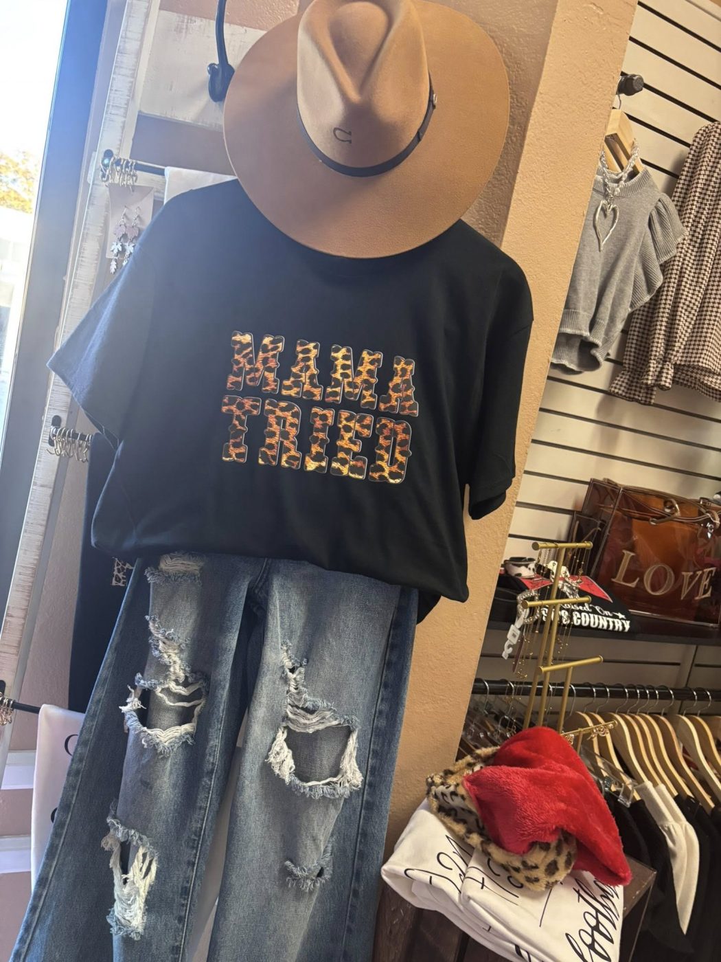 Bold, country, and a little rebellious—the Mama Tried Graphic Tee brings vintage western attitude with a modern edge. Featuring a standout graphic on a classic black tee, this piece is soft, comfortable, and made for everyday wear. Perfect with denim, boots, or layered for effortless cowgirl style.