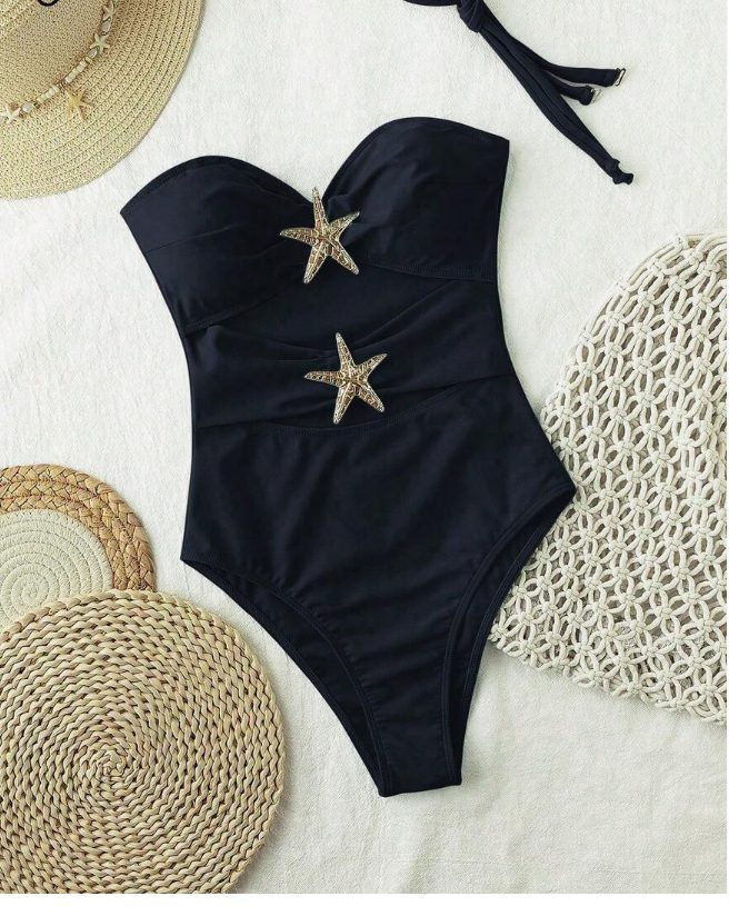 Make a statement in our Midnight Star One-Piece Swimsuit—a sleek black swimsuit designed to turn heads from every angle. Featuring eye-catching cutouts and gold star accents, this piece combines classic style with a bold, modern edge.