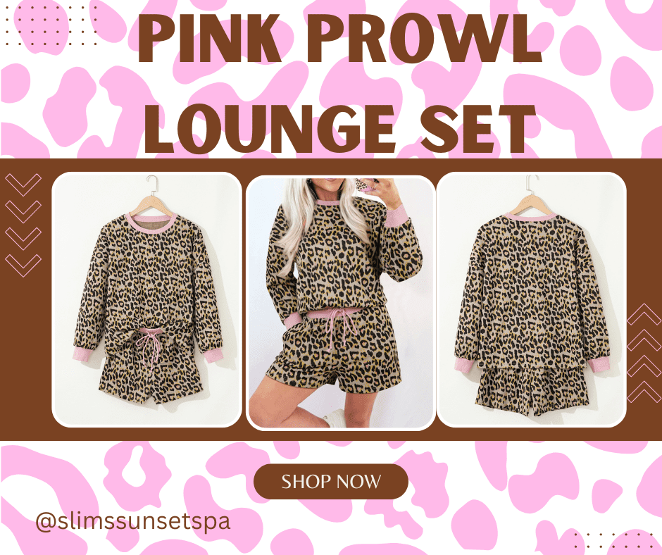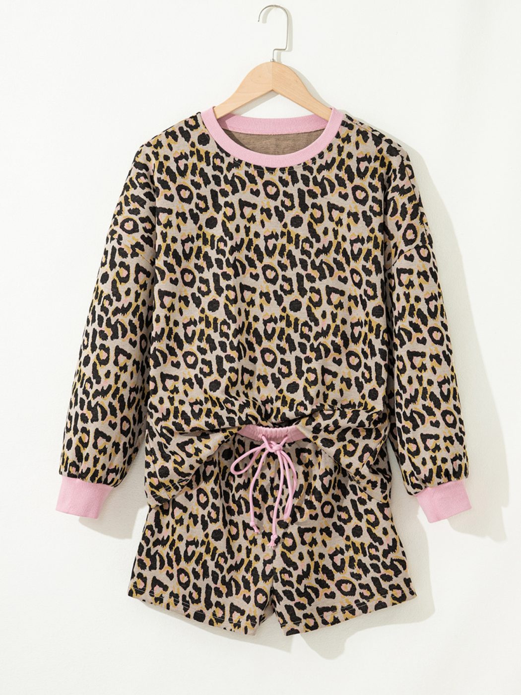 Comfort, but make it cute. The Pink Prowl Lounge Set features a playful leopard print with soft pink ribbed trim for a feminine, elevated touch. This two-piece set includes a relaxed long-sleeve crew neck pullover and matching shorts with an elastic waistband and adjustable drawstring for an easy, flattering fit.
