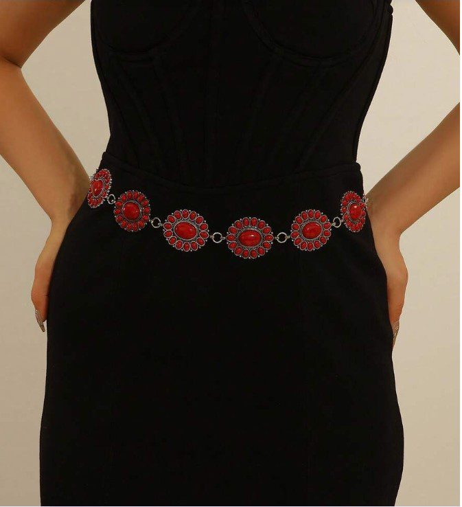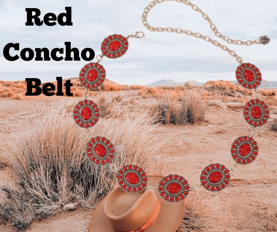 The Red Concho Belt is a true western statement piece, featuring vibrant red oval conchos surrounded by detailed silver-tone settings and linked together with a classic chain design.