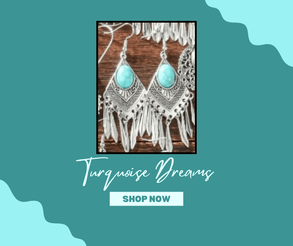 Designed to stand out, the Turquoise Dreams Earrings feature a striking turquoise stone set in an ornate silver-tone frame, finished with cascading fringe details for beautiful movement. The geometric shape adds a modern edge while the turquoise brings that classic southwestern charm.