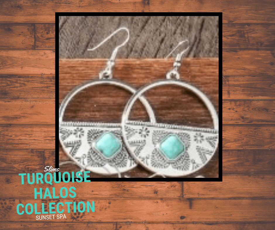 Modern with a western soul, the Turquoise Halo Earrings feature a sleek silver-tone circular design accented with an engraved half-moon detail and a bold turquoise center stone. The open halo silhouette keeps them lightweight while still making a statement.